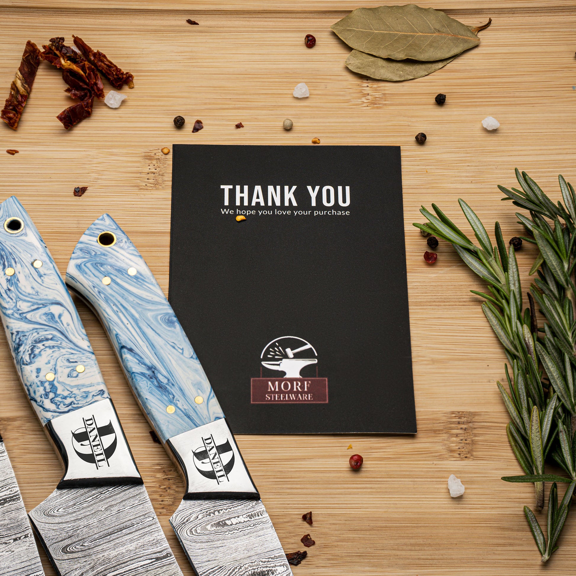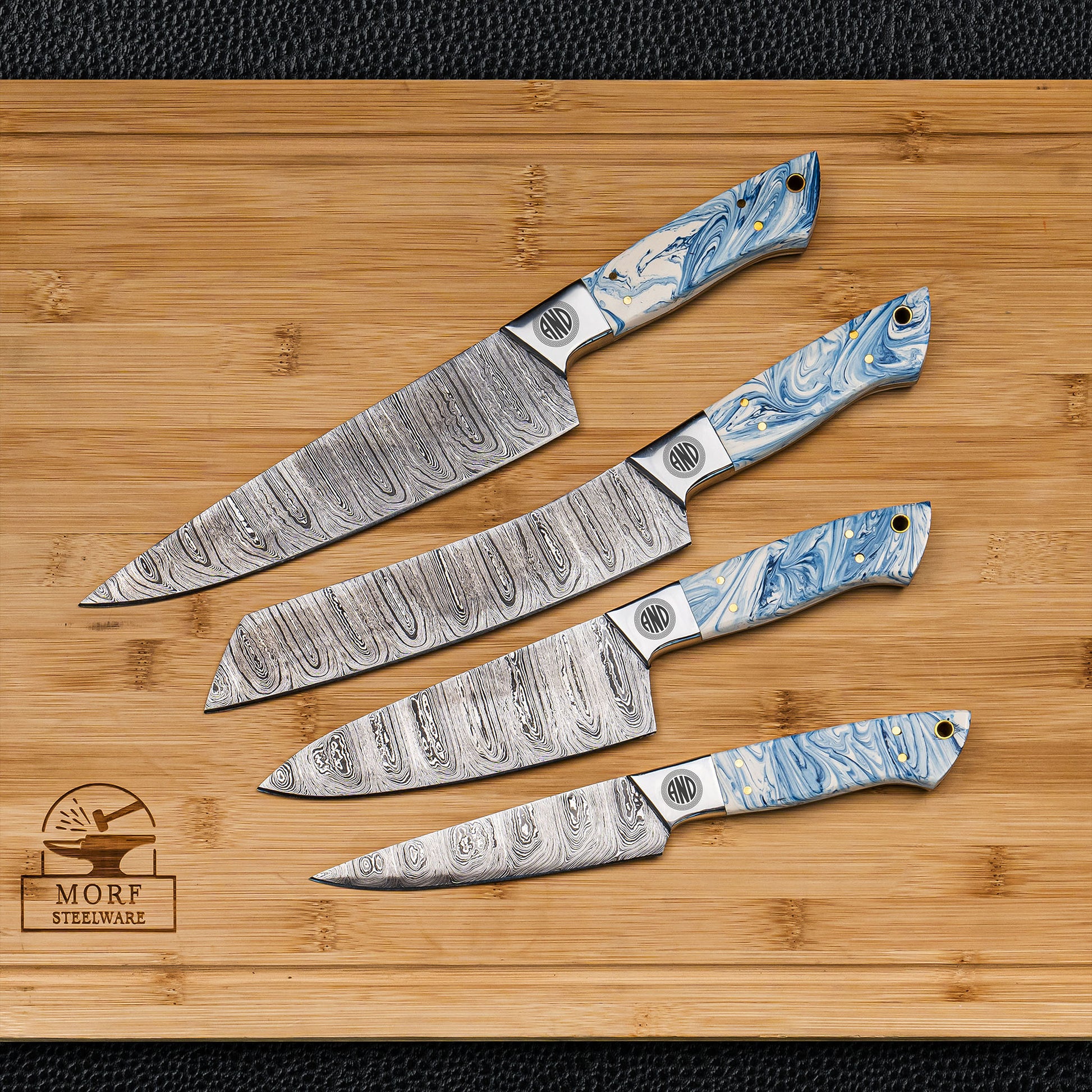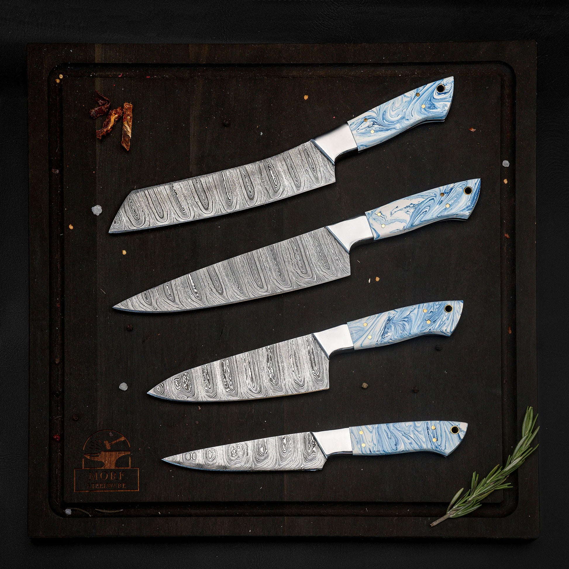 Designed with elegance and functionality in mind, these knives feature ergonomic handles made of epoxy blue resin. The stunning resin handles not only provide a comfortable grip but also add a touch of sophistication to your kitchen aesthetic.